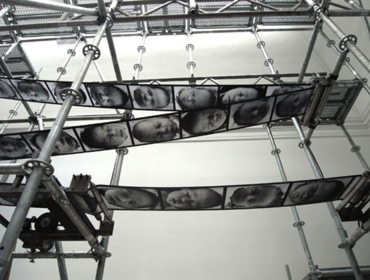 Boltanski'nin Chance çalışmasına baktığımızda seyircinin çerçevenin içine yerleşmesi durumu iyice çığrından çıkıyor ve yukarıda bahsettiğim izleyicinin tüm benliğiyle çalışmanın içine dalması gerçekleşiyor. Bu sefer bir yandan fotoğraflar mekana yayılırken, diğer yandan bütün mekanın içinde hareket halindeler ve sizi sarıp sarmalıyorlar. Yine bir Venedik Bienali'nde rast gelip hayran kaldığım işlerden olan, 2011 yılında Fransız Pavilyonu'nda gösterilen Chance, metal borulardan oluşan ve seyirciyi hem boyut, hem hareket hem de seslerle ezen bir enstalasyon. Odanın içinde dönen imgeler Polonya gazetelerinde rutin bir şekilde yer alan doğum haberlerinden alınan bir günlük bebeklerin fotoğraflarıdır. Yaklaşık 10 dakika aralıklarla bir zil sesi duyulur ve arka odadaki videoda görüntü donarak tek bir bebek fotoğrafına odaklanır. Bu yüksek sesli, klostrofobik ve insansı bir yandan korkunç olan yerleştirme; tamamen şans ve kimlik üzerine kurulmuştur. Ölüm ve doğum arasındaki ince çizginin sorgulanması ve bunun bebek fotoğrafları üzerinden yapılması tüyler ürpertici bir his vermekte.