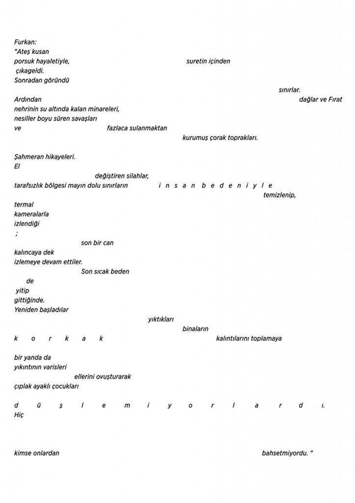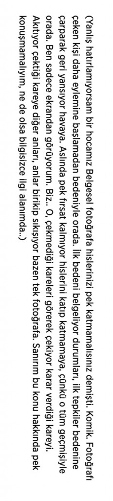 Birdenbire, kendimi- bozarak fotoğraflarımın yüzeylerini, kesip içlerinden parçalar- ülkeler yaratırken buluyorum. Olmayan eşsiz alanlar ama bildiğim her sokağını, didik didik. Gittiğim yerler geliyor aklıma. Benzemiyor bunlara. Ne hisleri, ne dizgeleri.